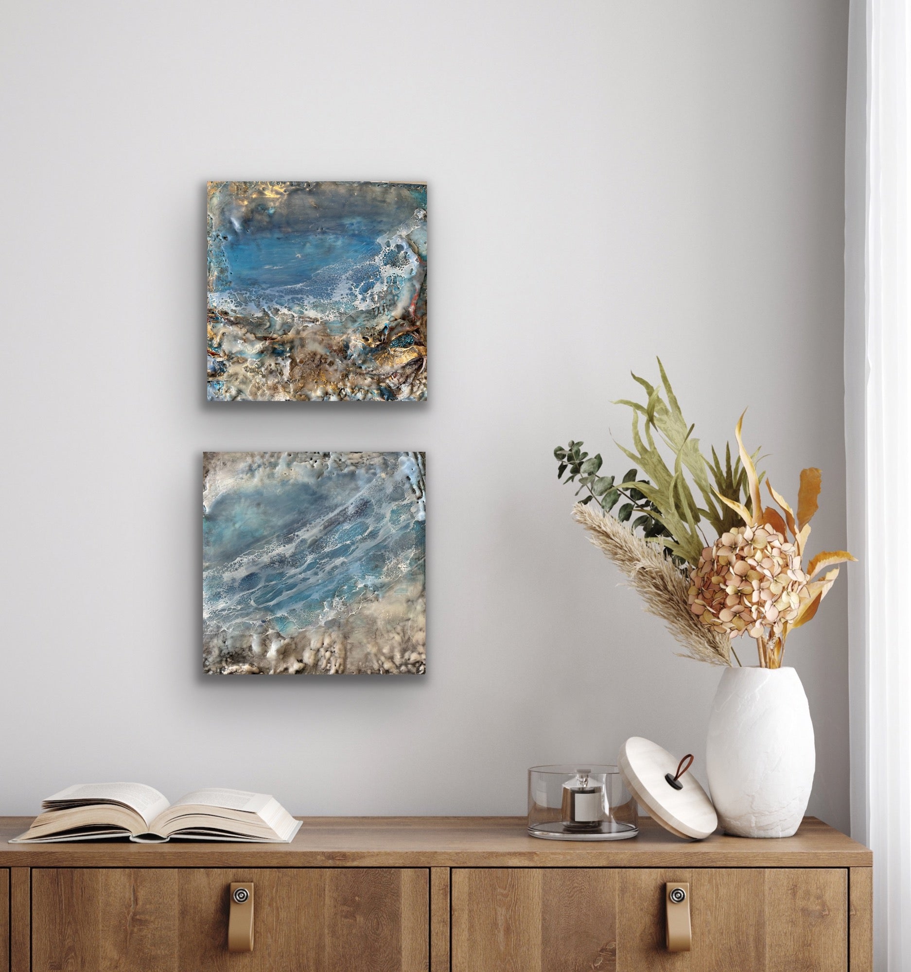 Encaustic mixed media on wood panel, 12"h x 12"w